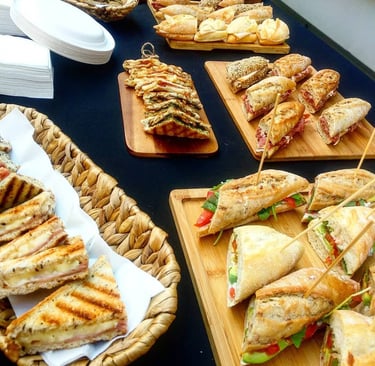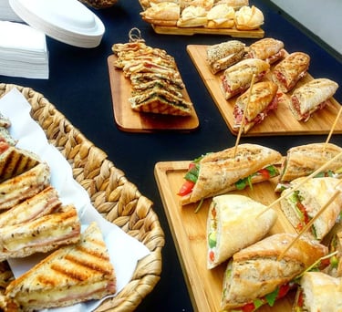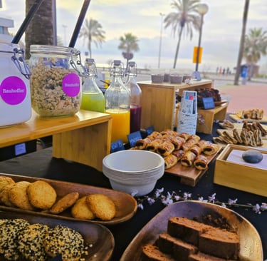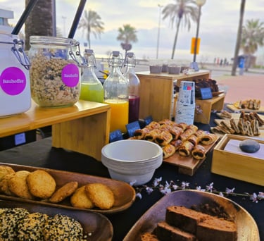 Buffets completos con productos caseros, zumos naturales, cafés, bollería artesanal, fruta, yogures, sandwiches calientes y estación de huevos opcional.